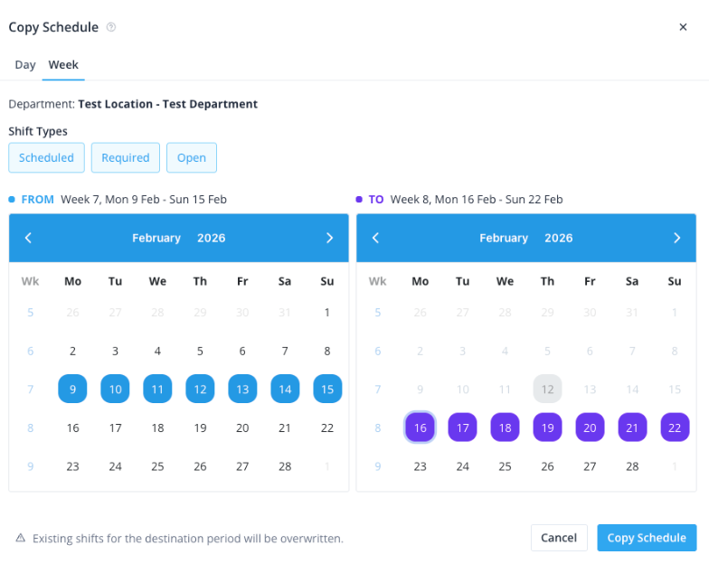 We have completely redesigned the Copy Schedule Modal functionality to give you more control when planning ahead. You can now clearly select specific departments and shift types (Scheduled, Required or Open) while having a side-by-side calendar view to ensure your shifts are moved exactly where they need to be.