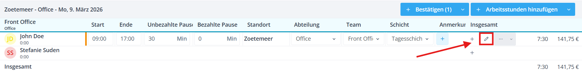 Wenn die Zeiterfassung korrekt ist, kannst du die geleisteten Stunden nun genehmigen. Ändere dazu den Status von Ausstehend auf Bestätigt.