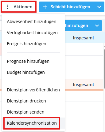 Um deinen Kalender zu verknüpfen, gehe auf den Reiter Dienstplan und klicke auf den Pfeil in der oberen rechten Ecke auf der Schaltfläche Aktion. Klicke dann auf Kalendersynchronisation.