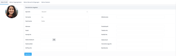 Wenn du oben rechts auf dein Icon klickst, kannst du via das Menü Mein Profil deine persönlichen Profildaten aktualisieren. So kannst du die Sprache ändern, ein Foto hochladen und dein Profil aktualisieren. Standardmäßig ist eingestellt, dass ein Mitarbeiter alle eigenen Profildaten anpassen darf.