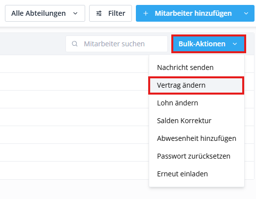 Der Vertrag kann entweder individuell für einzelne Mitarbeiter geändert werden, oder als Bulk-Aktion für mehrere ausgewählte Mitarbeiter.