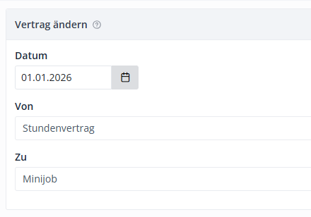 ⚠️Vorsicht: Je nachdem welches Datum bei dem Vertragsstart gewählt wird, werden Änderungen ab diesem Datum greifen, auch rückwirkend. Dies kann den Urlaubsanspruch beeinflussen und wenn es schon Auszahlungen in der Vergangenheit geb, müssten diese erneut im System registriert werden.