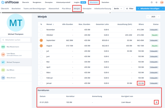 Wenn ein Minijob Mitarbeiter schon Stunden gearbeitet hat (weil mit Shiftbase beispielsweise erst Mitte des Monats begonnen wurde), kann man diese über eine Bulk-Aktion > Salden Korrektur hinzufügen.