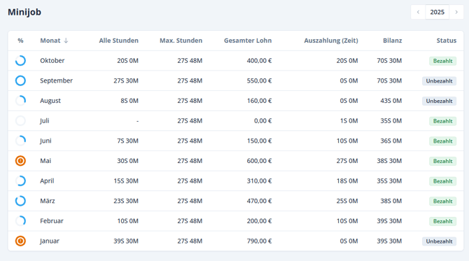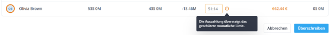 Wenn man mit der Maus über den Kreis auf der rechten Seite geht, werden einem der Prozentsatz der monatlichen Arbeitsstunden angezeigt, sprich wie viel Prozent der monatlich Grenze der Mitarbeiter in dem Monat genutzt hat. Wenn die Grenze überschritten ist, wird der Kreis orange und zeigt die Warnung an.