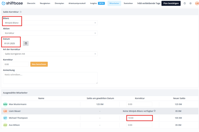 Wenn ein Minijob Mitarbeiter schon Stunden gearbeitet hat (weil mit Shiftbase beispielsweise erst Mitte des Monats begonnen wurde), kann man diese über eine Bulk-Aktion > Salden Korrektur hinzufügen.
