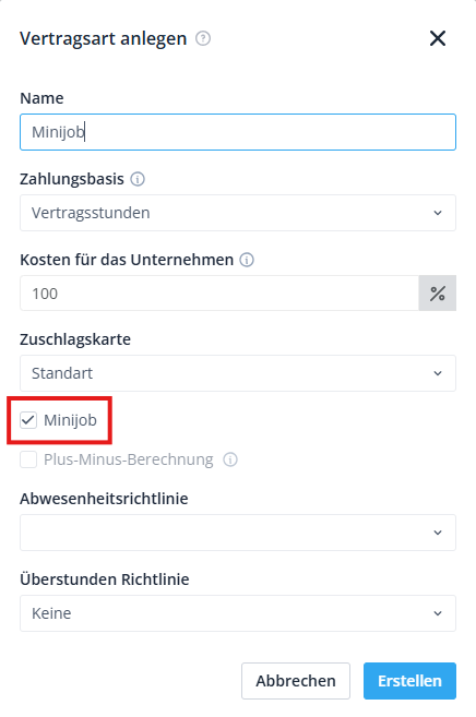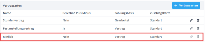 Standardmäßig kommt das System mit einem Minjob-Vertrag. Dieser kann in den Einstellungen unter Mitarbeiter > Vertragsarten gefunden werden.