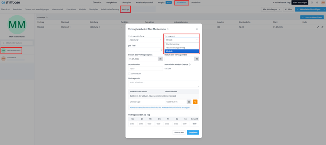Damit ein Mitarbeiter als Minijobber verwaltet werden kann, muss er den richtigen Vertrag hinterlegt bekommen, bei dem diese Funktion aktiviert ist. Anschließend ergibt sich – abhängig vom Stundenlohn – eine maximale Anzahl an Stunden, die pro Monat gearbeitet werden sollten und entsprechend ausgezahlt werden können.