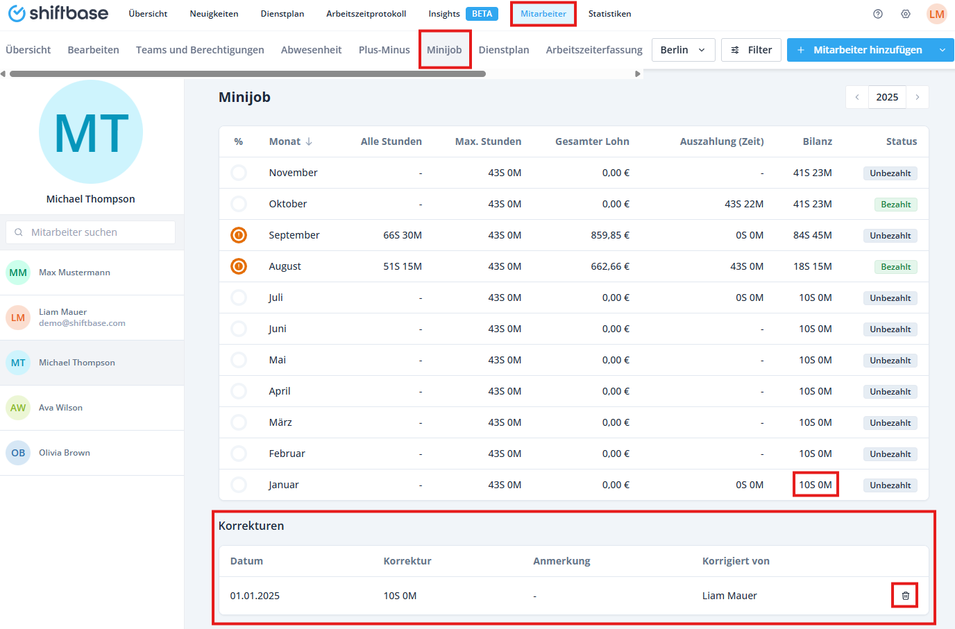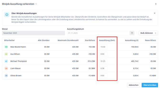 ⚠️Achtung: Es werden immer alle Minijobber gleichzeitig bearbeitet. Man kann diese nicht individuell auswählen. Wenn eine Änderung nachträglich gemacht wird, kann man die ausgezahlte Zeit nur für einen Mitarbeiter ändern, aber alle Mitarbeiter in der Liste werden mit aktualisiert, was zum Beispiel ein neues Auszahlungsdatum verursachen kann.