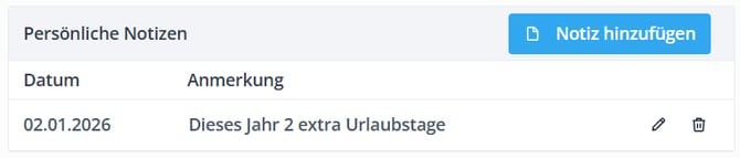 Um Notizen hinzuzufügen, gehe zum Reiter Mitarbeiter. Klicke dort auf den Namen des Mitarbeiters, dessen Notizen du verwalten möchtest. Im Reiter Übersicht oben links siehst du unten auf der Seite den Bereich Persönliche Notizen.