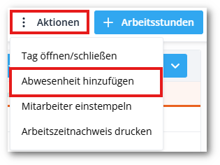 Im Arbeitszeitprotokoll > Aktionen kann man ebenfalls eine Abwesenheit hinzufügen.