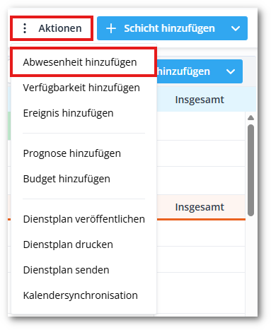 Man kann die Abwesenheiten auch im Dienstplan > Aktionen eintragen.