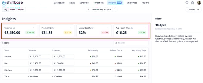 | Premium / Enterprise | Insights+ (Beta) | Turnover, Expenses, Diary + KPI cards (Productivity, Labour Cost %, Average Hourly Wage) |