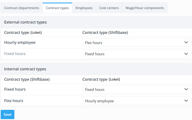 For any contract type available within Loket.nl, map the corresponding contract type within Shiftbase. Any contract type from Shiftbase can be linked to Hourly employee or Fixed hours in Loket.nl.