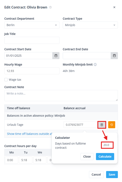 A Minijobber works on average 2 days per week and is entitled to 4 weeks of holiday per year, resulting in 8 holiday days annually. To calculate this correctly, the time-off balance in the contract should be set to 20 days per year. The contract hours for 2 days can include an average number of hours to generate an accurate amount of days.