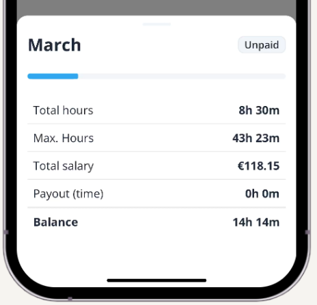 Here you can see all past approved worked hours per month and if those have been paid out or not. If hours have not been paid out, or an employee has worked more in a month than they got paid out, the amount will show in the balance for the next month.