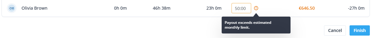 Hovering over the circle on the right side shows the percentage of monthly work hours — that is, how much of the employee's monthly limit has been used in that month. If the limit is exceeded, the circle turns orange and displays the warning.