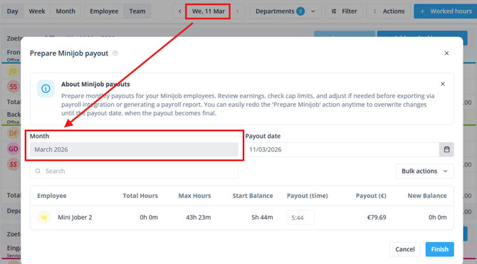 The payouts for the Minijob employees can be prepared in the timesheet > actions > prepare Minijob payout. This function is a preparation, that can be adjusted later again. There will not be a payout made, this is just a preparation in order to export your payroll hours and mark the hours as paid in Shiftbase.