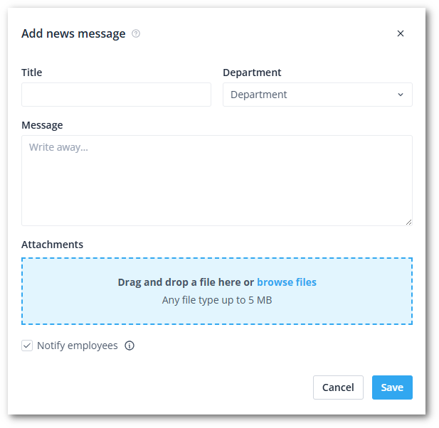 - Notify employees: If this checkbox is checked, the employees will receive a notification about the News item. If this box is unchecked, no message will be sent, but the employees within the selected department(s) will be able to see this message on the News tab.
