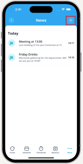 For adding a News item you will need to go More > News and select the small + in the upper right corner