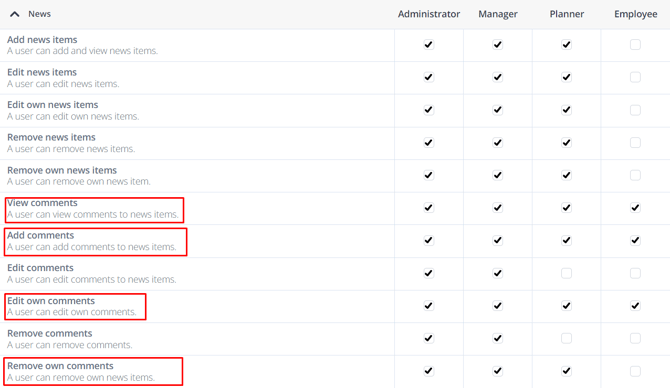 To ensure that employees can post and view comments, you need to give employees the appropriate permissions to do so.