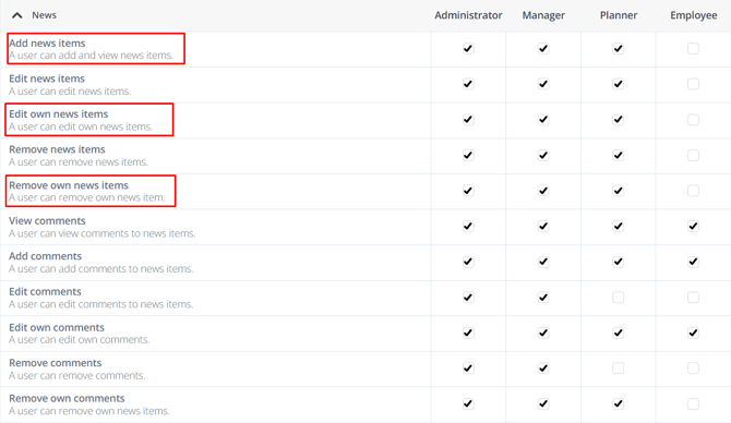 To ensure that employees can add and view News items, you need to give employees the appropriate permissions to do so.