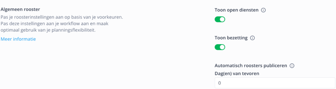 - Automatisch roosters publiceren - Dag(en) van tevoren: Hier kun je het aantal dagen invoeren dat medewerkers het rooster van tevoren kunnen zien. Leer meer over het publiceren van roosters in dit artikel.