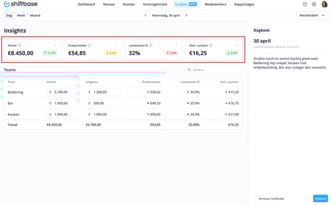 De Insights-pagina is jouw centrale dashboard om de prestaties binnen je bedrijf te volgen. Of je nu een restaurant, winkel of dienstlocatie runt, het geeft je snel inzicht in hoe verschillende teams en afdelingen presteren.