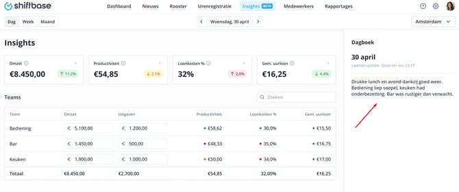 - Teamproblemen te noteren (bijv. "2 no-shows in de keuken")
