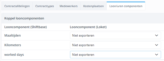 Het is mogelijk om de looncomponenten kilometers, maaltijden en worked days voor een medewerker door te geven aan Loket.nl als looncomponenten. Hiertoe selecteer je simpelweg achter het looncomponent in ons systeem het juiste externe looncomponent uit Loket.nl.