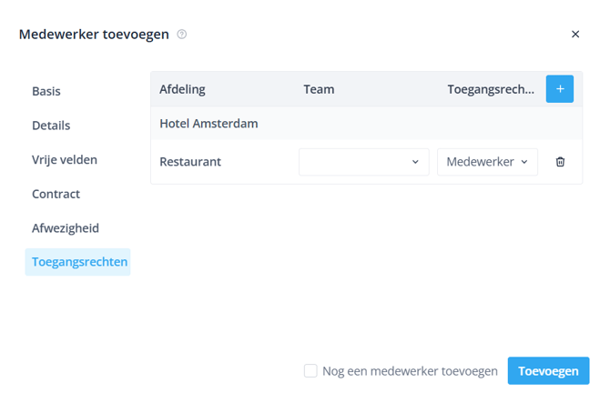 Een nieuwe medewerker kan aan verschillende afdelingen worden toegewezen. Druk op de +-knop om een afdeling toe te voegen. Vervolgens kun je per afdeling (optioneel) een team selecteren met de bijbehorende rechten die voor de nieuwe medewerker gelden.