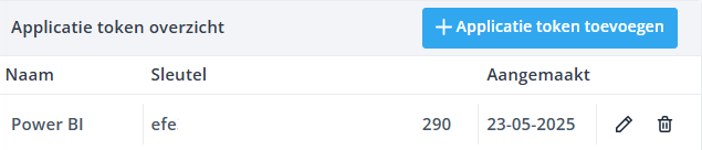 Nadat je een naam hebt opgegeven, zul je naar het overzicht van alle tokens worden genavigeerd. Hier vind je dan de sleutel en kan je eventueel meerdere tokens aanvragen door op +Applicatie token toevoegen te drukken.