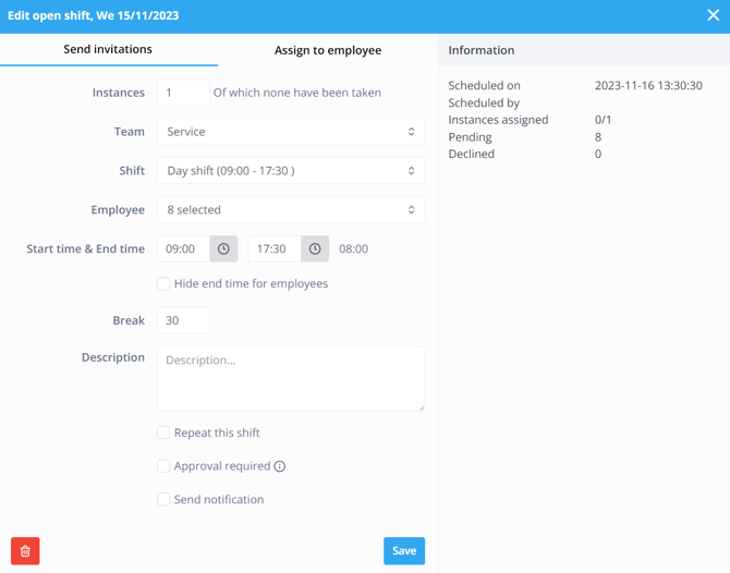 Employee: The employees that can be invited for this shift. You can pick multiple employees out of the dropdown menu.