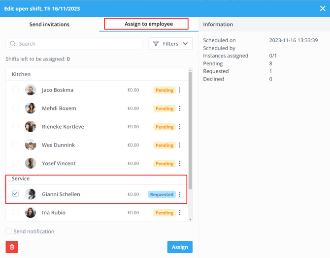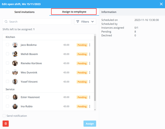 You can also click on the dots behind the name of the employee to assign the shift. This way you can add multiple employees. Last but not least, don't forget to click on Assign.