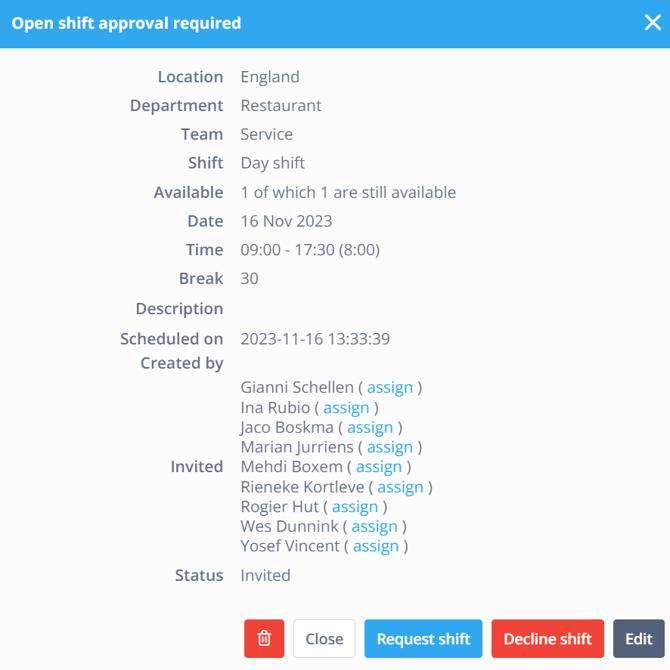 Approval required: Check this box if you want to choose the employee that is supposed to get the shift from among all employees that showed interest in the shift.