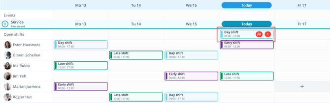 When the employees have registered, you can see this in the schedule at the open shift. You can recognise it by the red figure symbol.